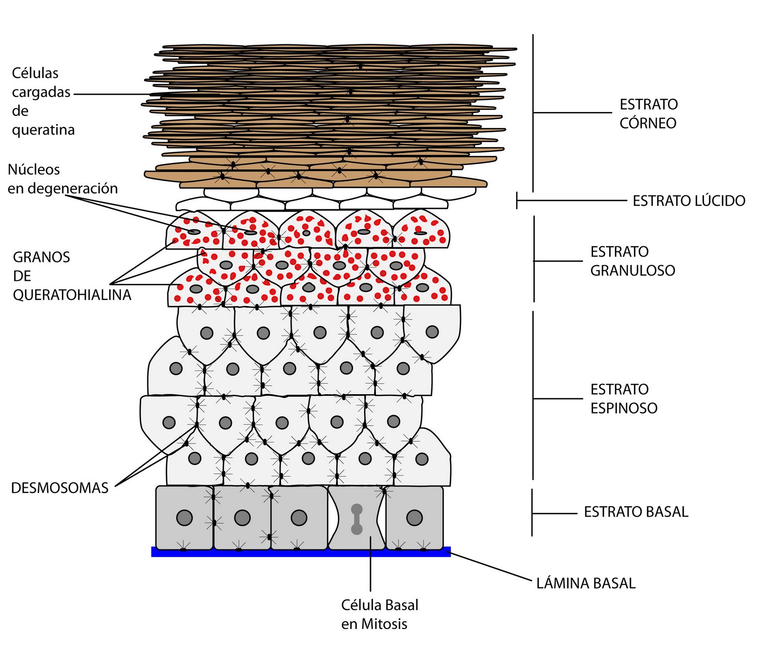En la capa basal es donde se crean las células de la epidermis que poco a poco van subiendo hacia el estrato córneo donde pierden su núcleo y se convierten en las que conocemos como células muertas.